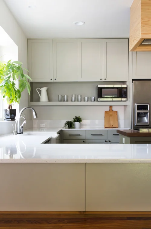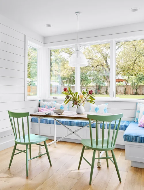 The result is exactly what the homeowner wanted, both in design and function. Stuart preserved the spirit of the original house's charm; the new house looks like it has always stood in this neighborhood. The clean interior offers efficiency with a warm, modern look. A boldly decorated dining room, two guest bedrooms and a bright bathroom make up the house's front half. A compact custom storage wall leads into the cozy kitchen that's the heart of the home, featuring an island stove, sleek wood range hood and big window. The living room's ceiling height cleverly suggests the back window wall extends higher. A long wood deck hovers over the backyard and a generous roof overhang shades the home. The original house's shiplap was repurposed and now covers the staircase to the new studio apartment above the garage, both housed in a simple metal structure in the backyard.